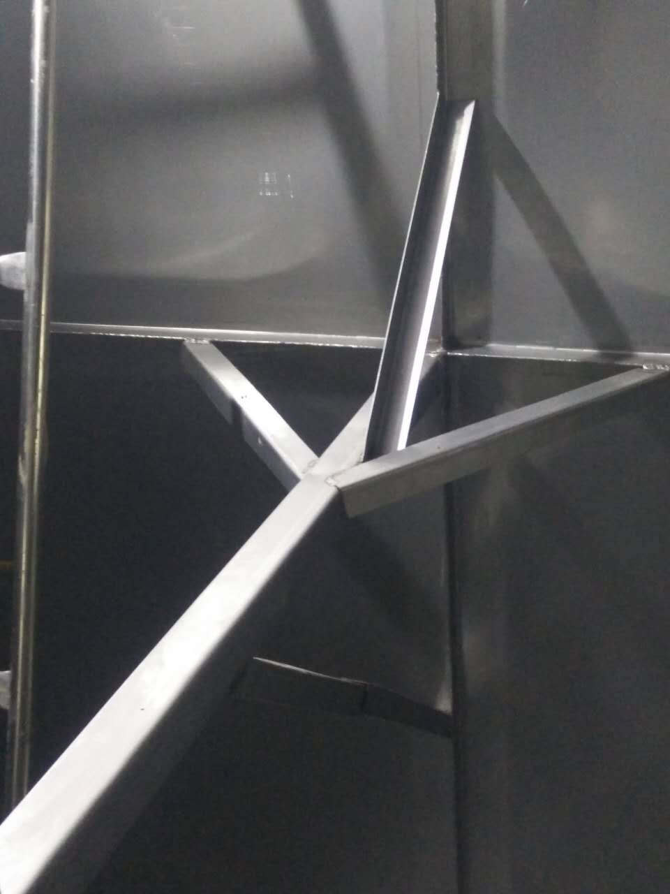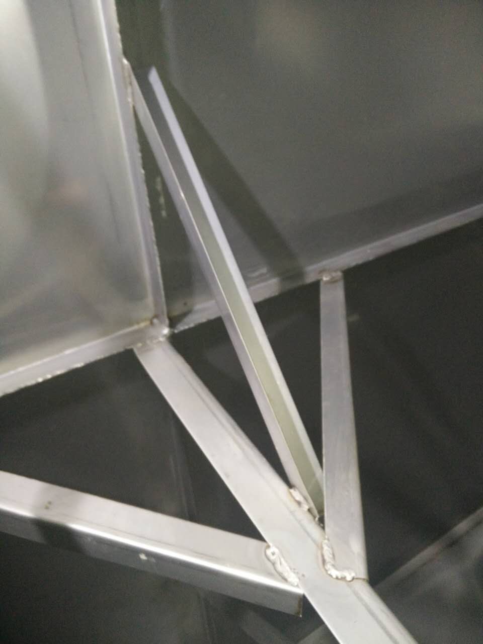 斜拉主要的作用在于分擔(dān)主拉筋的拉力,進(jìn)一步對(duì)水箱板進(jìn)行穩(wěn)固,切成500mm的長(zhǎng)度,連接在水箱與主拉之間。形成龍爪式,常規(guī)尺寸為4cm*1cm厚度一般以靠近頂部的側(cè)板厚度為基準(zhǔn),連接處必須進(jìn)行滿焊處理。